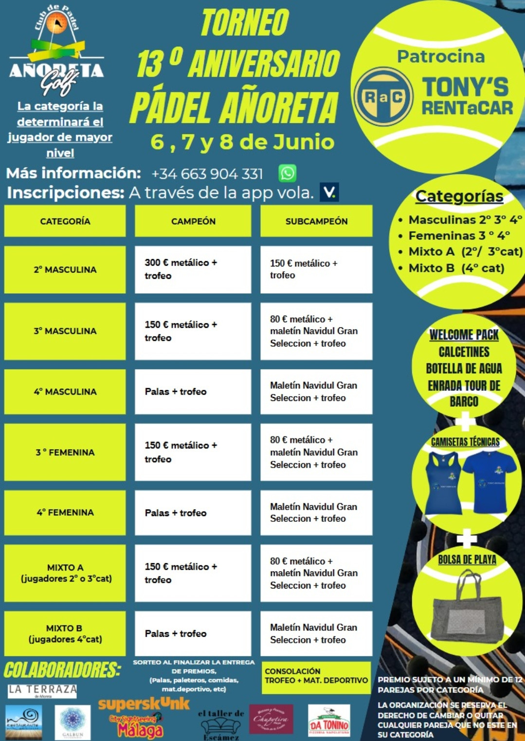 13 ANIVERSARIO PADEL AÑORETA 1ª TORNEO TONY´S RENT A CAR